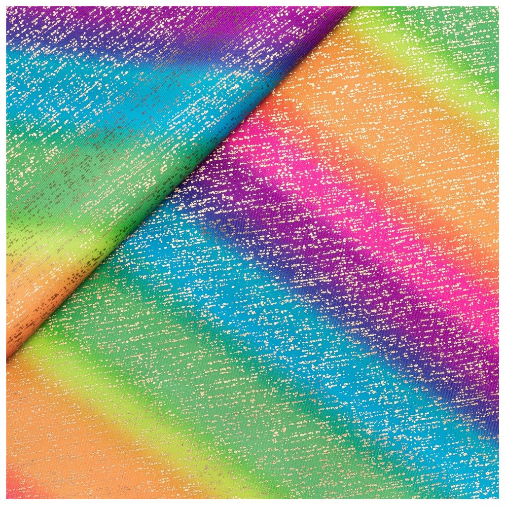 Ein origineller und farbenfroher elastischer Stoff mit Regenbogenmuster, der sofort ins Auge fällt. Durch seine Dehnbarkeit ist er ideal für Tanzkostüme, Badeanzüge, Bikinis, Leggings, Trikots, Bodys, Overalls und Kleider. Die leuchtenden Farben verleihen jedem Stück Energie und einen einzigartigen Stil. Hergestellt von einem europäischen Produzenten, mit einer Zusammensetzung von 80 % Polyamid und 20 % Elasthan sowie einem Flächengewicht von 200 g/m².