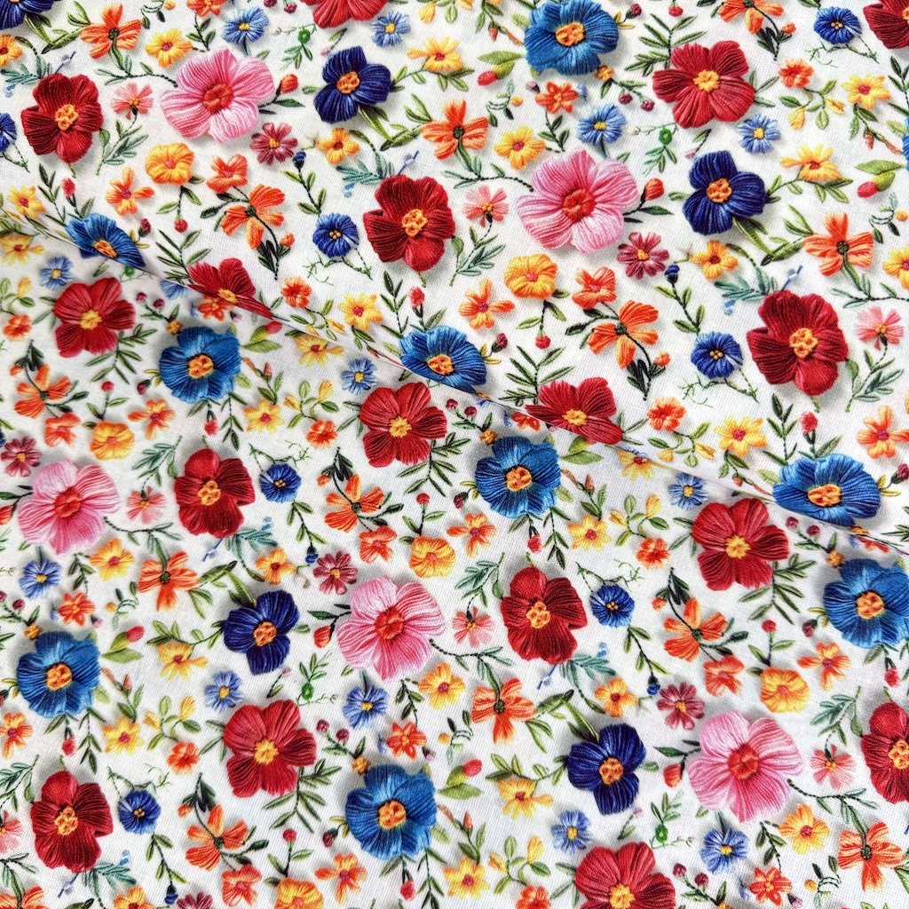 Baumwolle digital 3D - Bunte gestickte Blumen