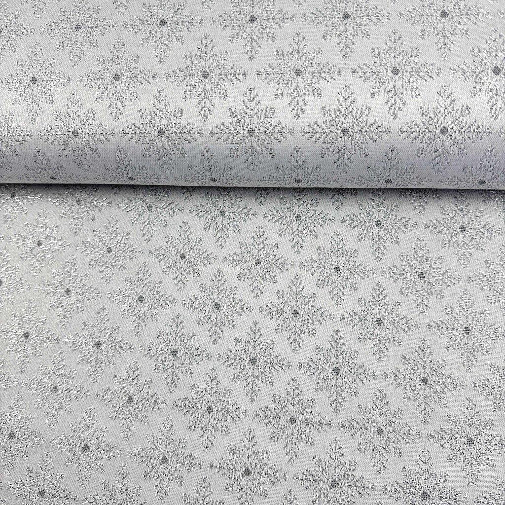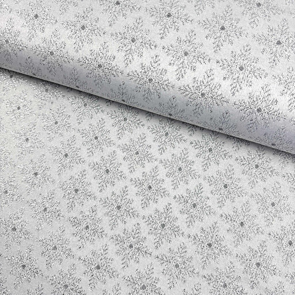 Dekorativer Qualitätsstoff mit einer Materialzusammensetzung von 55% Polyester, 45% Baumwolle und einem Gewicht von 225 g/m2, verwoben mit silbernem Lurexfaden. Der Stoff ist ideal zum Nähen von Kissen, Decken, Tischdecken, Vorhängen und verschiedenen anderen Dekorationen.