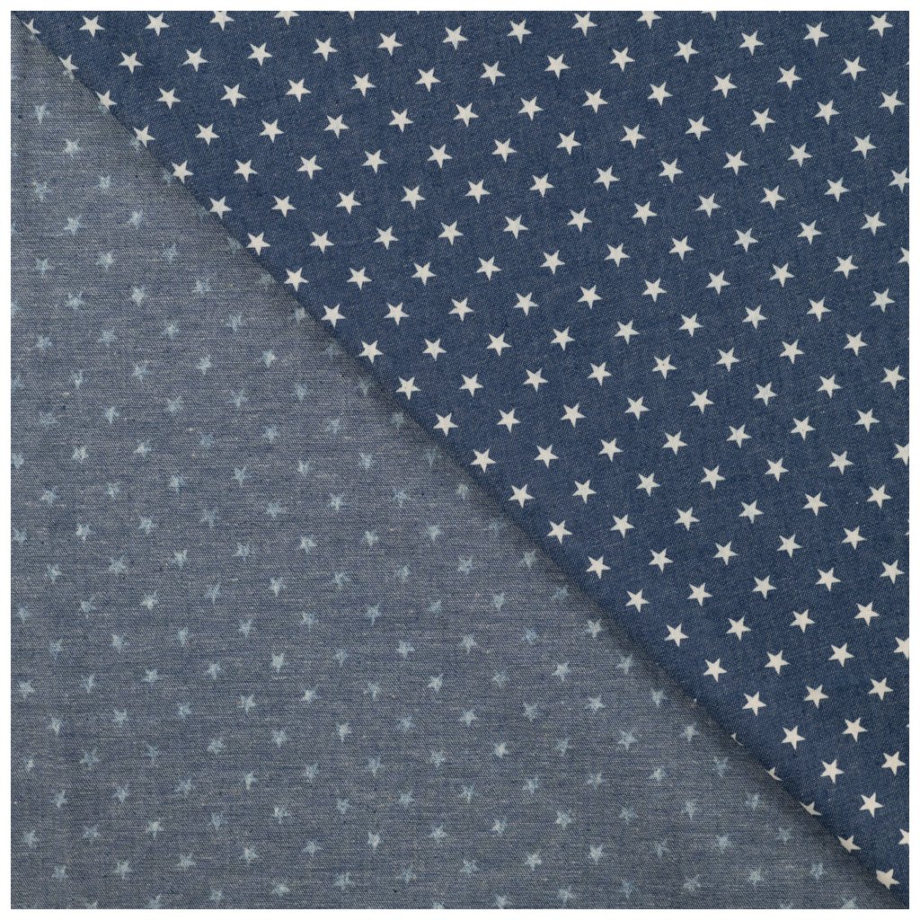 Dieser hochwertige Kleiderstoff aus 100 % Baumwolle ist die ideale Wahl für leichte und bequeme Kleidung. Das Chambray-Gewebe mit einem Gewicht von 140 g/m² ist angenehm weich im Griff und zugleich ausreichend fest und strapazierfähig für den täglichen Gebrauch. Der blaue Hintergrund wird von einem dezenten, aber dennoch auffälligen Muster aus kleinen, gleichmäßig verteilten weißen Sternen geschmückt, das dem Stoff eine verspielte und frische Optik verleiht. Dank seiner Leichtigkeit und Atmungsaktivität eignet er sich ideal für Kleider, Röcke, Hemden, Blusen oder Kinderbekleidung.