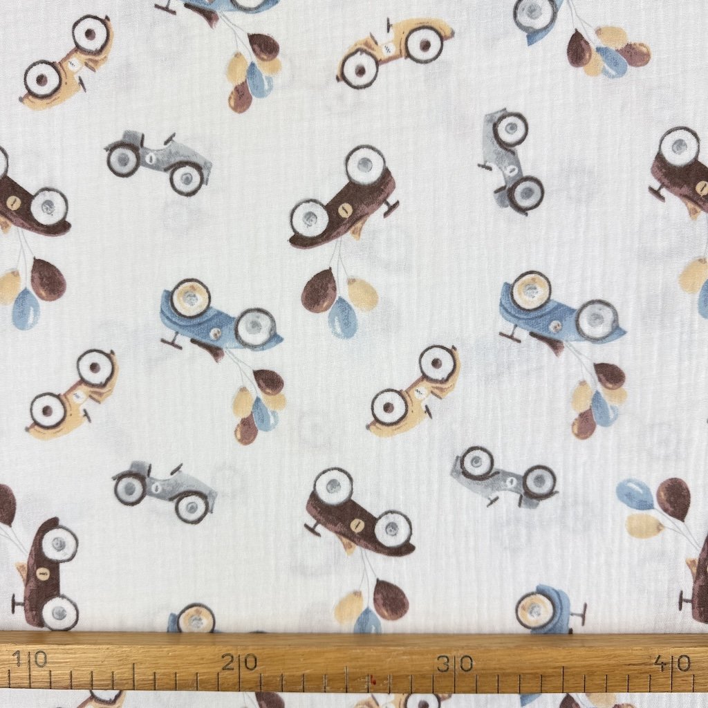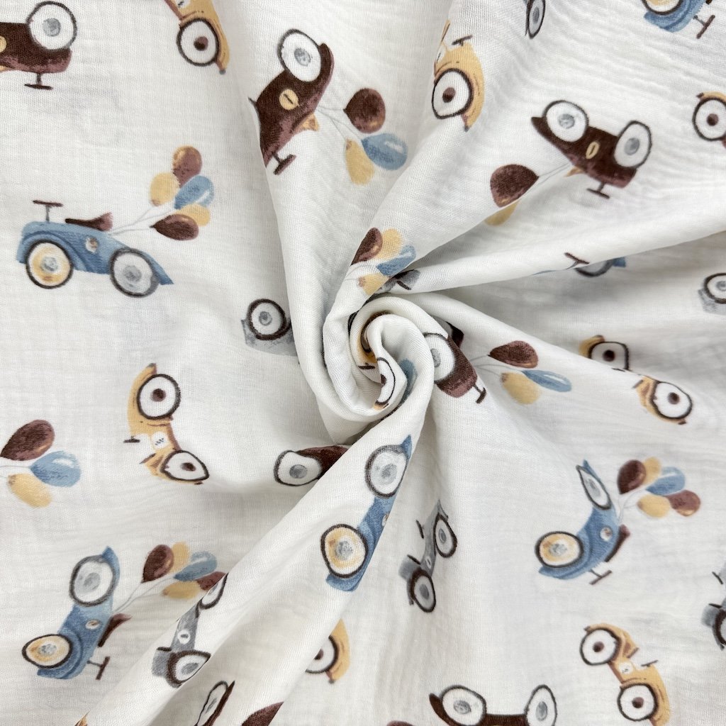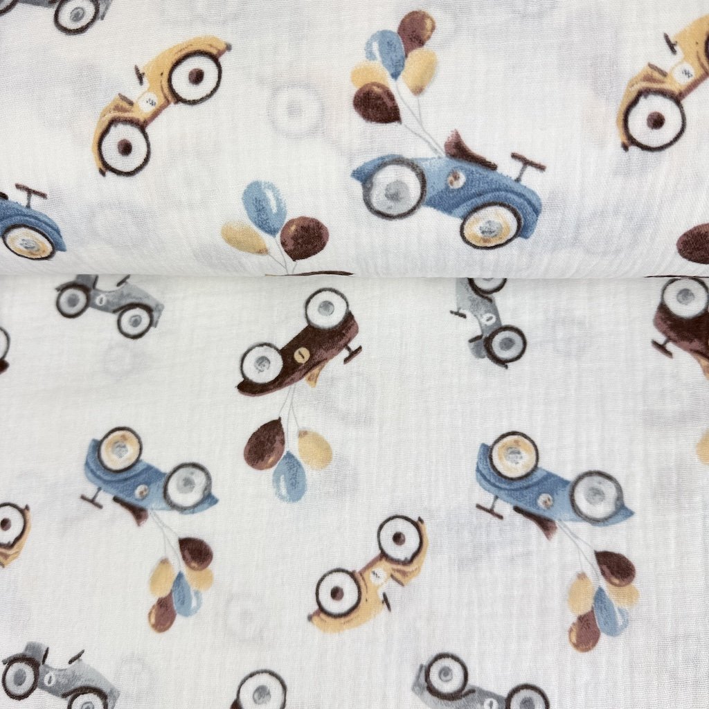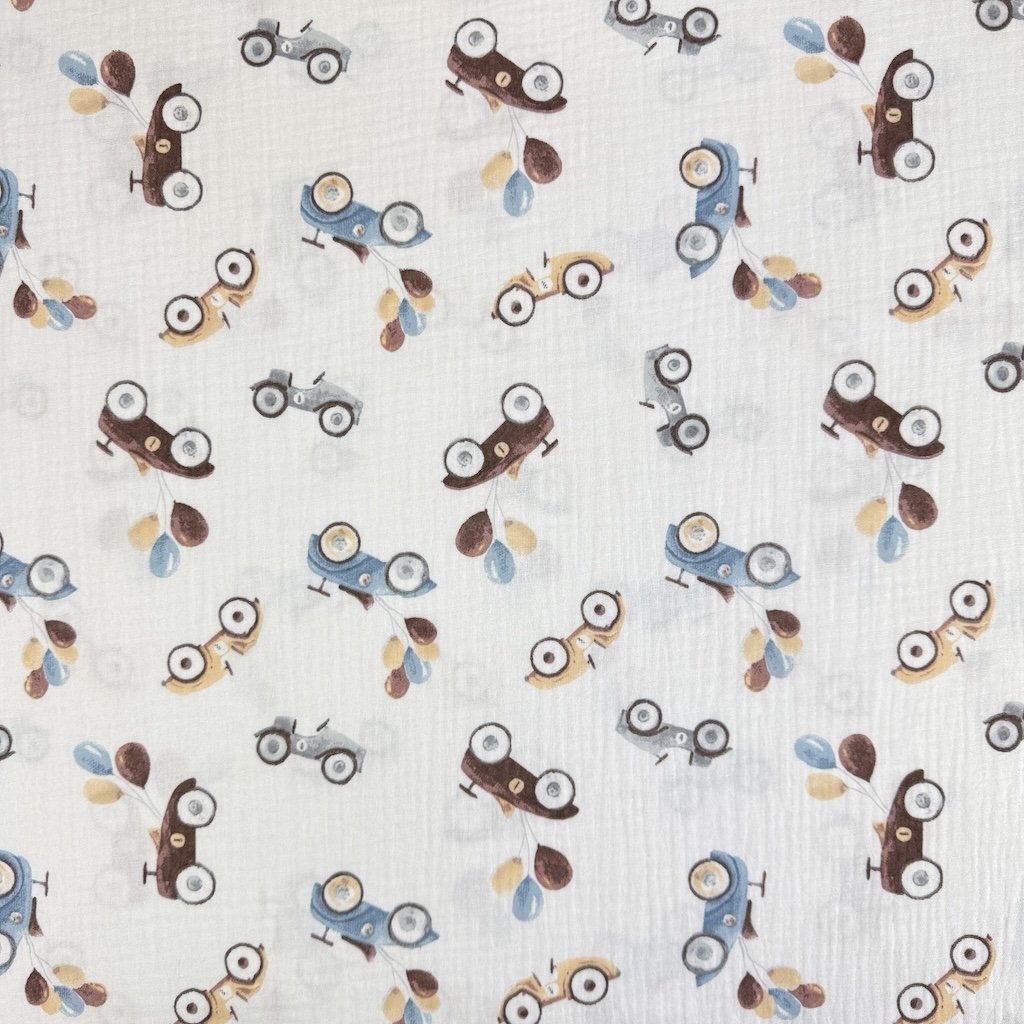 Gemusterter Musselin / Doppelgaze, auch als Mullstoff bekannt, ist ein feiner, luftiger und besonders angenehmer Stoff aus 100 % Baumwolle. Dank seiner typischen gekreppten (gewellten) Struktur ist er von Natur aus leicht elastisch, weich im Griff und bügelfrei. Die doppelte Gaze sorgt für Stabilität, während Leichtigkeit und Atmungsaktivität erhalten bleiben. Elegante Muster verleihen dem Stoff eine originelle Optik, die sich ideal für Kinder- und Damenbekleidung sowie für Wohnaccessoires eignet. Musselin ist besonders beliebt für Sommerkleider, Blusen, Röcke, Hemden, Babybodys, Einschlagtücher, Decken oder Tücher.