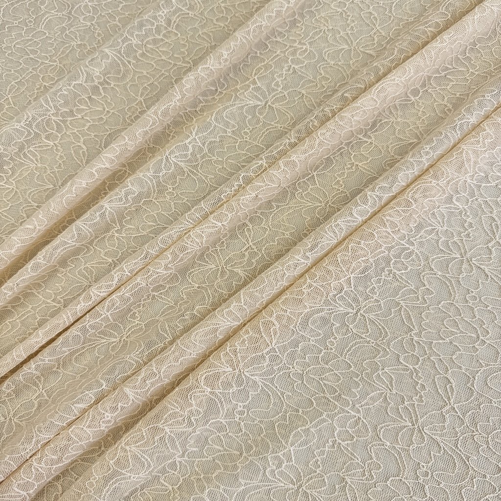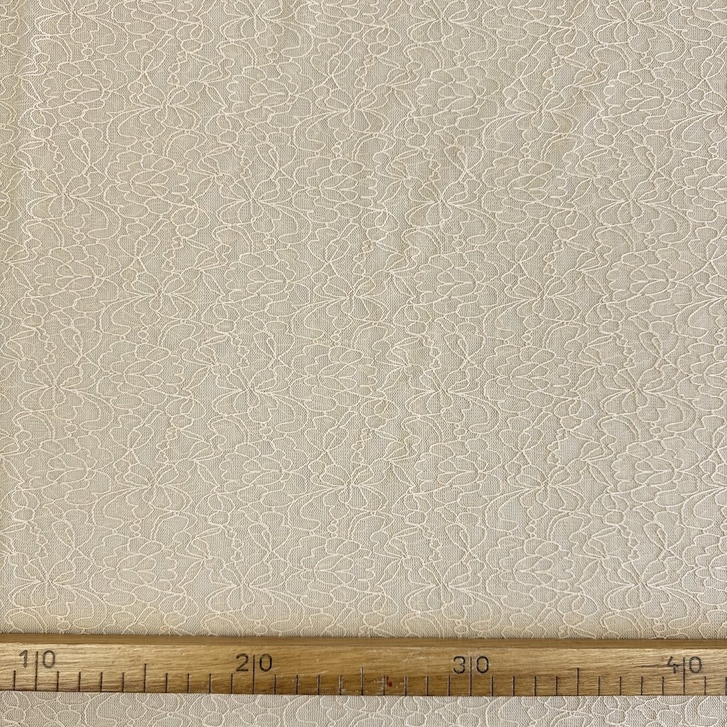 Hochwertige elastische Spitze von einem europäischen Hersteller mit einer Zusammensetzung von 90 % Polyamid und 10 % Elasthan sowie einem Gewicht von 50 g/m².
