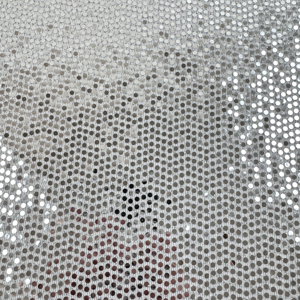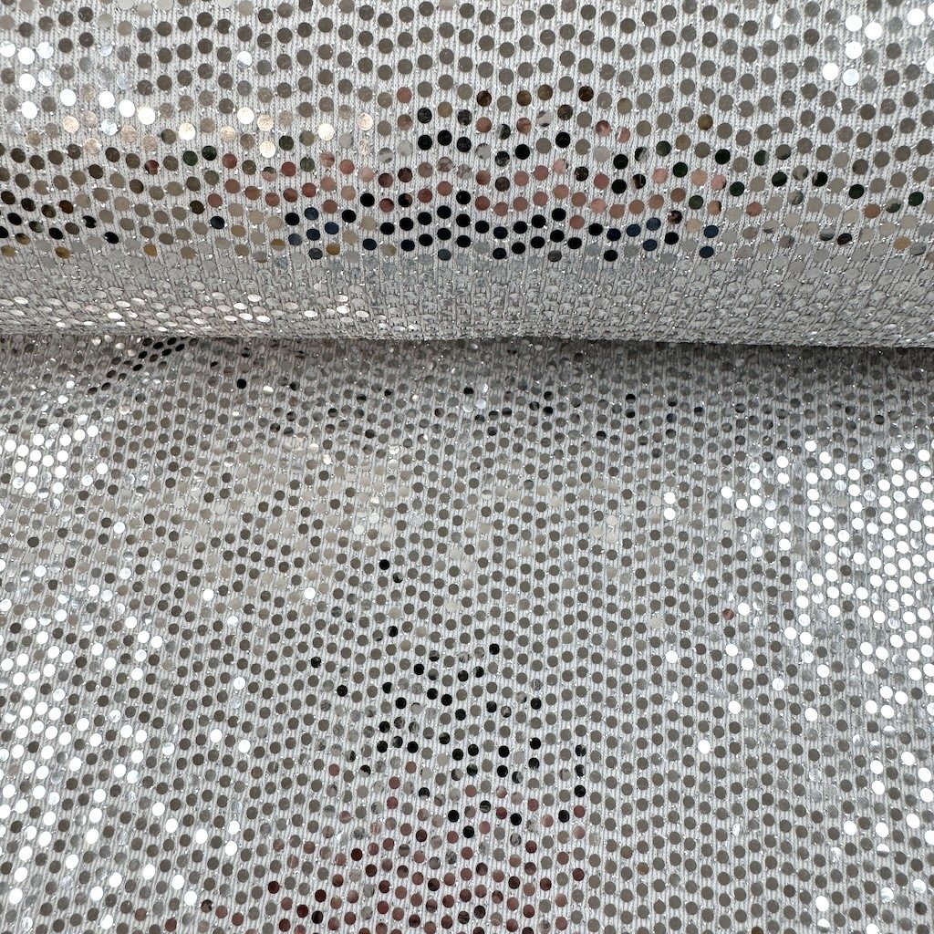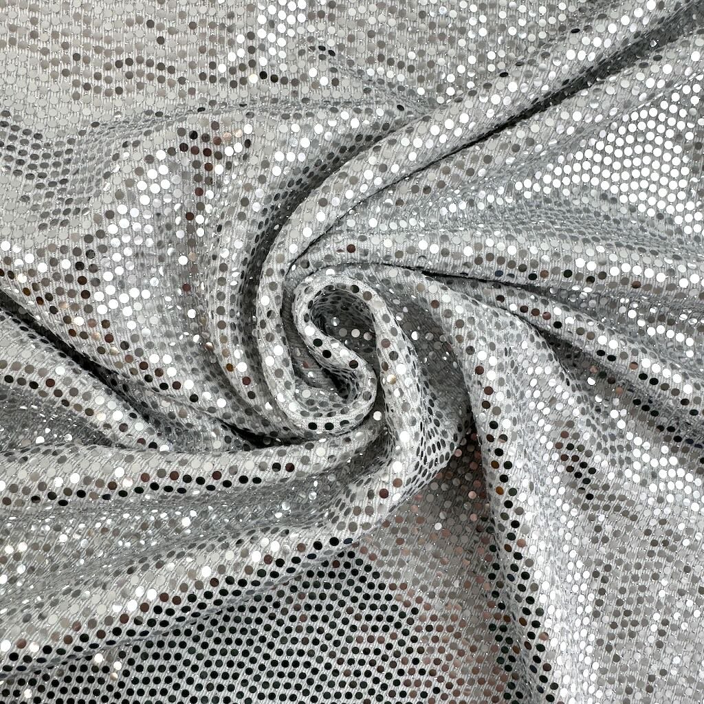 Weißer Strick mit glänzenden silbernen Pailletten, geeignet für Tanzkleidung.