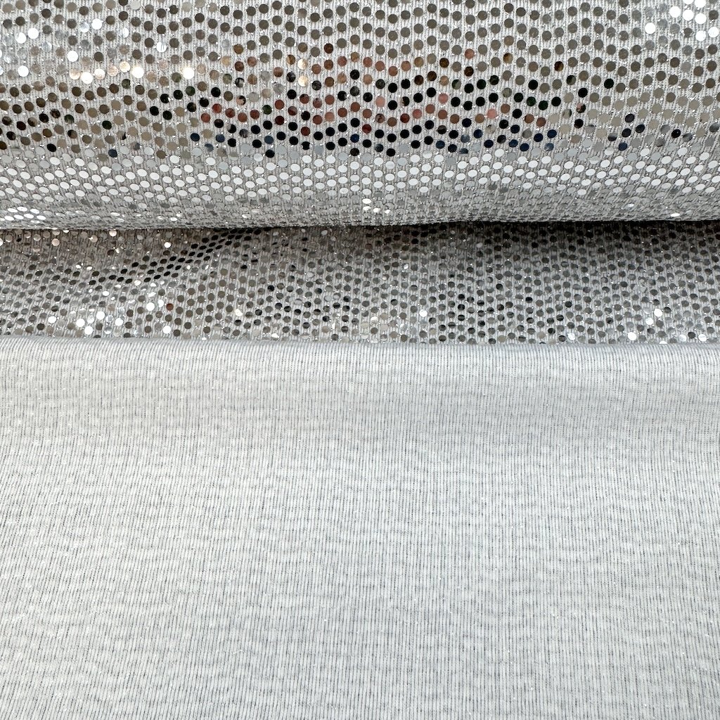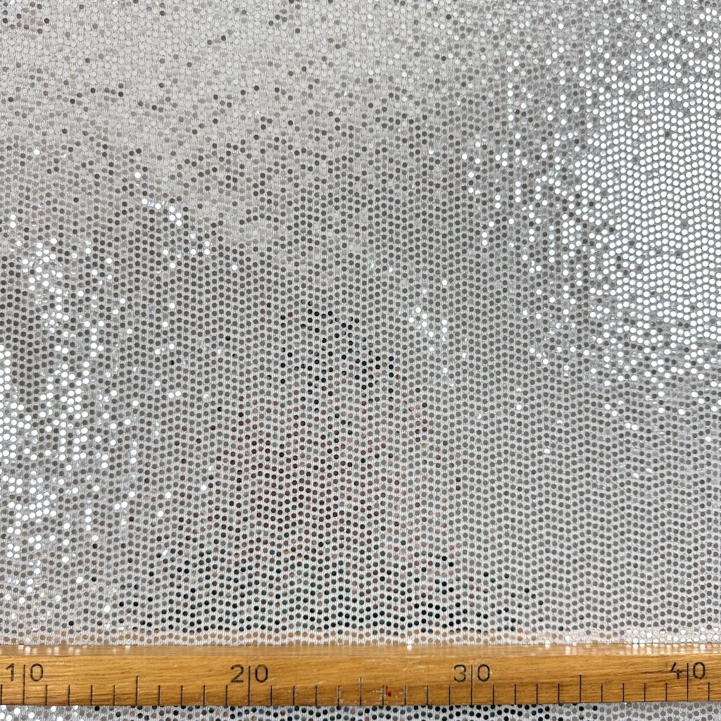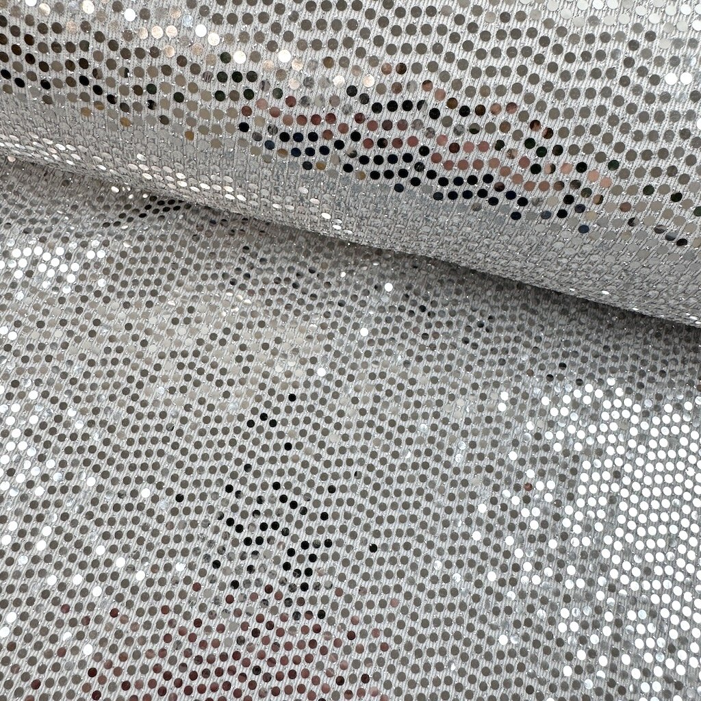 Weißer Strick mit glänzenden silbernen Pailletten, geeignet für Tanzkleidung.