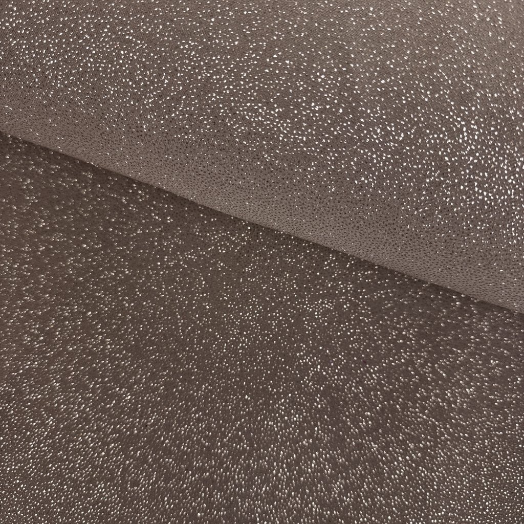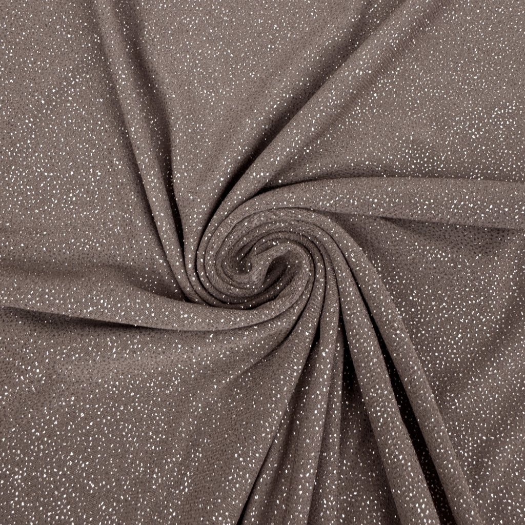 Einfarbiger Jersey mit Glitzer ist ein hochwertiger Stoff mit einem Gewicht von 250 g/m² und einer Zusammensetzung von 95 % Polyester und 5 % Spandex. Er ist angenehm zu tragen und eignet sich zum Nähen von Festkleidern, Sommerkleidern, Tuniken, Tops, Röcken und Hosen.
