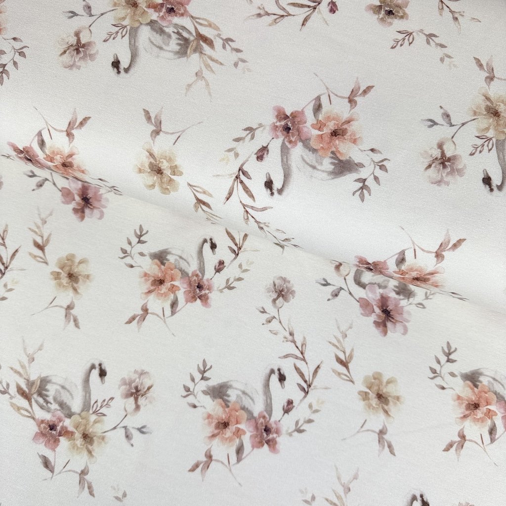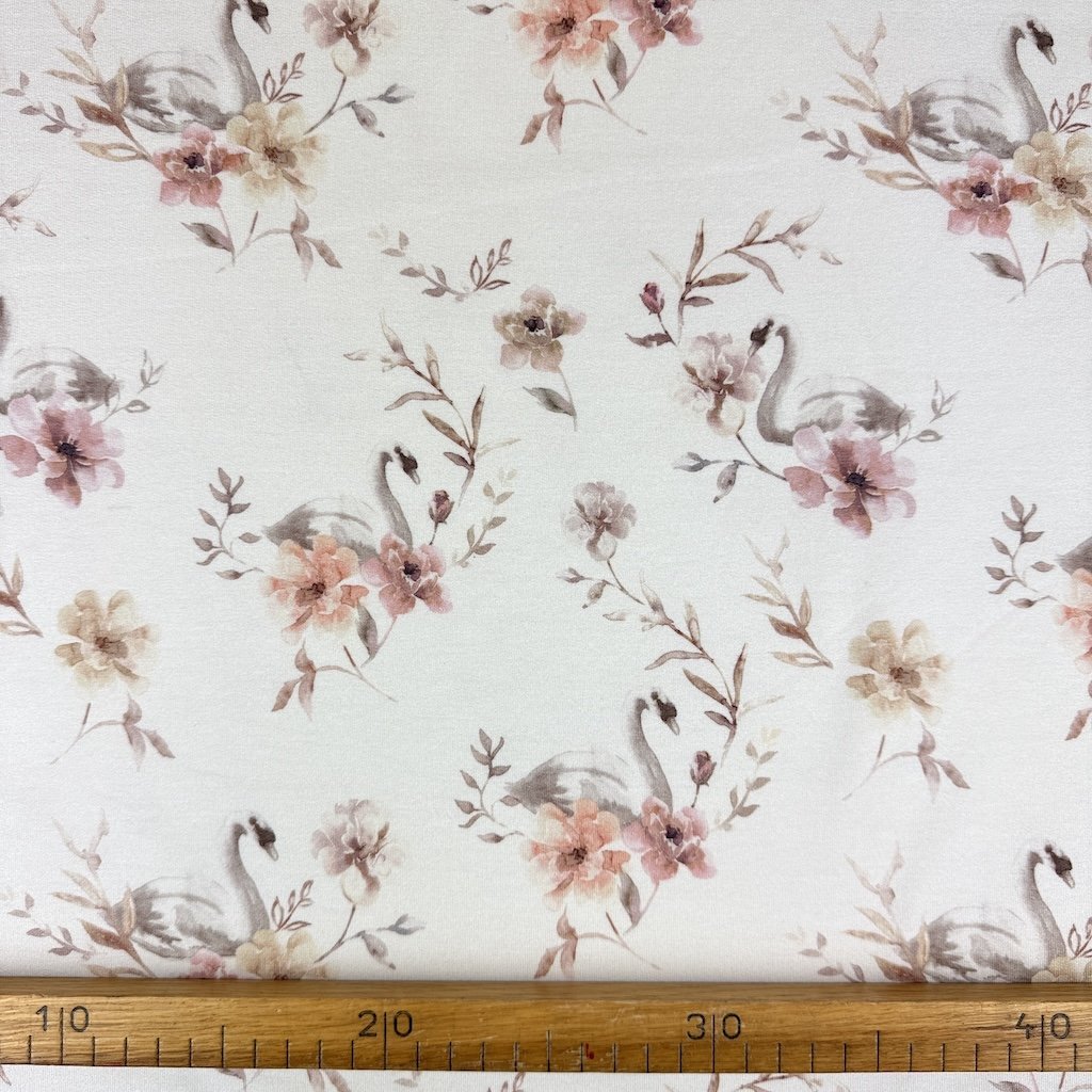 Sweatstoff Digital Organic – Puderfarbene Schwäne auf Butterfarbe